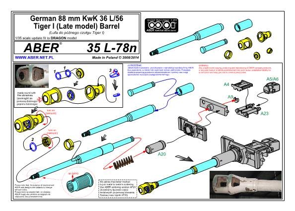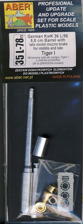 Für den deutschen Panzer Tiger I mittlere und späte Version bringt ABER ein in Aluminium gedrehtes Geschützrohr heraus. Im Lieferumfang befinden sich das mehrteilig gedrehte Rohr der neuen Generation mit den Rohrzügen im vorderen Mündungsbereich, eine in Messing gedrehte mehrteilige Mündungsbremse, ein kleiner Bogen Ätzteile und die Einbauanleitung.