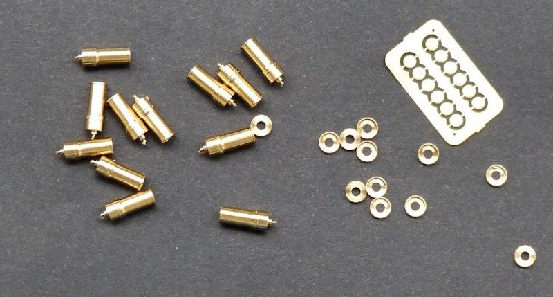 In der typischen durchsichtigen Verpackung befinden sich12 hervorragende aus Messing gedrehte Nebelwurfbecher. Diese sind aufgebohrt und erlauben einen Einblick. 12 Abdeckkappen und eine winzige Ätzteilplatine mit weiteren runden Abdeckplatten vervollständigen das Set.