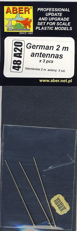 Als willkommene Neuheit im Maßstab 1:48 gibt es von ABER einen Zurüstsatz mit drei 2 m Stabantennen, die perfekt konisch zulaufen und einen kleinen Montagestift enthalten. Da fragt man sich abermals: Wie gut sind die Nerven des Drehers? Außerdem liegt dem neuen Set ein kleiner Bogen Ätzteile für die Halterungen (Klemmring mit Flügelmutter) und die ausführliche Bauanleitung bei.