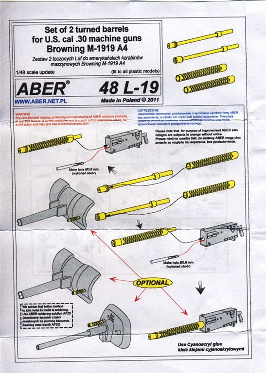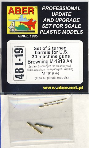 Auch für den kleineren Maßstab 1:48, für die amerikanischen cal.30 Browning MGs, bringt ABER in Messing gedrehte Gewehrläufe und Kühlmäntel heraus. Im neuen Set sind je zwei Läufe und Kühlmäntel enthalten. Nachdem es schon früher mal für das Browning MG einen Satz Gewehrläufe gab, allerdings musste hier noch der Kühlmantel aus einem Ätzteil gebogen werden, befinden sich im neuen Satz zwei sehr schöne, innen hohl, in Messing gedrehte Kühlmäntel.