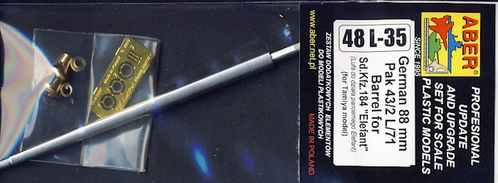 Für das aktuelle Tamiya Modell: German Heavy Tank Destroyer Elefant, im kleinerem Maßstab 1:48, ist dieses Geschützrohr geeignet. Es ist in der neuen Generation, mit vorderem Gewinde zum Aufdrehen des Mündungsdämpfers, gefertigt und so ausgeführt das es perfekt in die vorhandene Plastikgeschützrohrblende eingefügt werden kann.