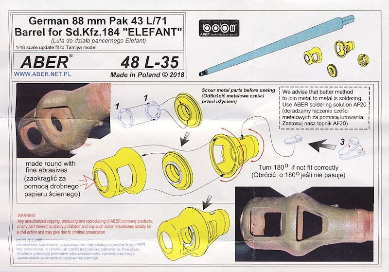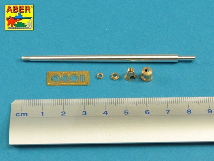 Für den deutschen schweren Jagdpanzer: Sd.Kfz.184 "Elefant" bringt ABER ein gedrehtes Geschützrohr mit separater Mündungsbremse heraus. Im Lieferumfang befinden sich das in Aluminium gedrehte Rohr mit den Rohrzügen im vorderen Mündungsbereich, eine in Messing gedrehte mehrteilige Mündungsbremse, ein kleiner Bogen Ätzteile und die farbige Einbauanleitung.