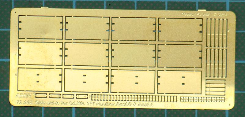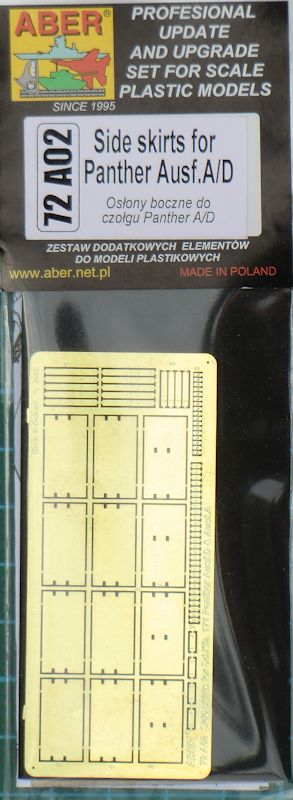 Für die verschiedenen Bausätze des Kampfpanzers Panther Ausf. A/D im Maßstab 1/72 hat ABER ein Detailset für die Seitenschürzen herausgebracht. Es gibt hier eine kleine Fotoätzteilplatine.