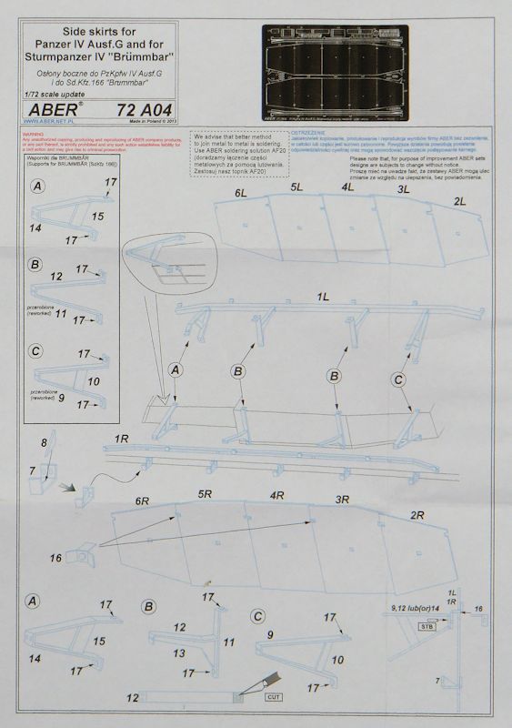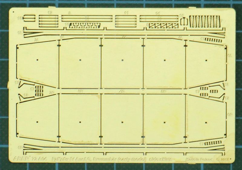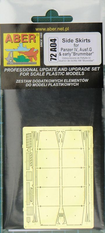 Für die verschiedenen Bausätze des PzKpfw. IV Ausf. G sowie für den frühen Brummbär im Maßstab 1/72 hat ABER ein Fotoätzteilset zur Darstellung der Schürzen an der Wanne herausgebracht. Es ist universell und nicht auf einen Bausatz ausgerichtet. Die Platine enthält alle notwendigen Teile um die Schürzen an den Grundpanzer anzubauen.