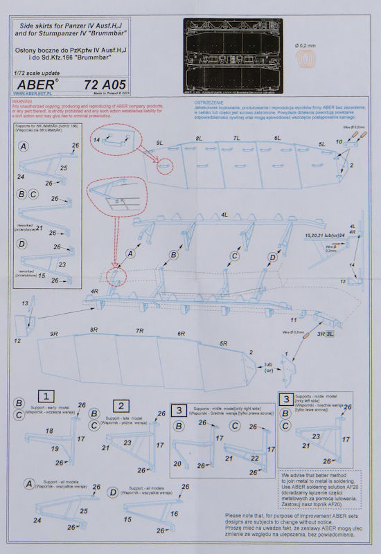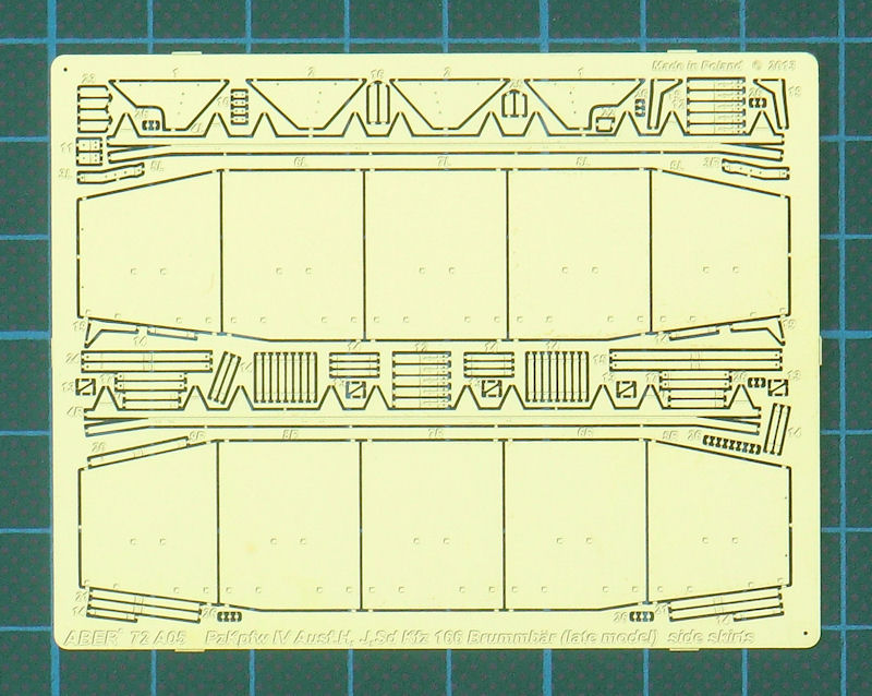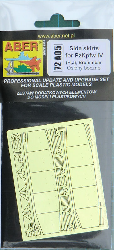 Für die verschiedenen Bausätze des PzKpfw. IV im Maßstab 1/72 hat ABER ein Fotoätzteilset zur Darstellung der Schürzen am Turm herausgebracht. Es ist universell und nicht auf einen Bausatz ausgerichtet. Die Platine enthält alle notwendigen Teile um die Schürzen an den Grundpanzer anzubauen.