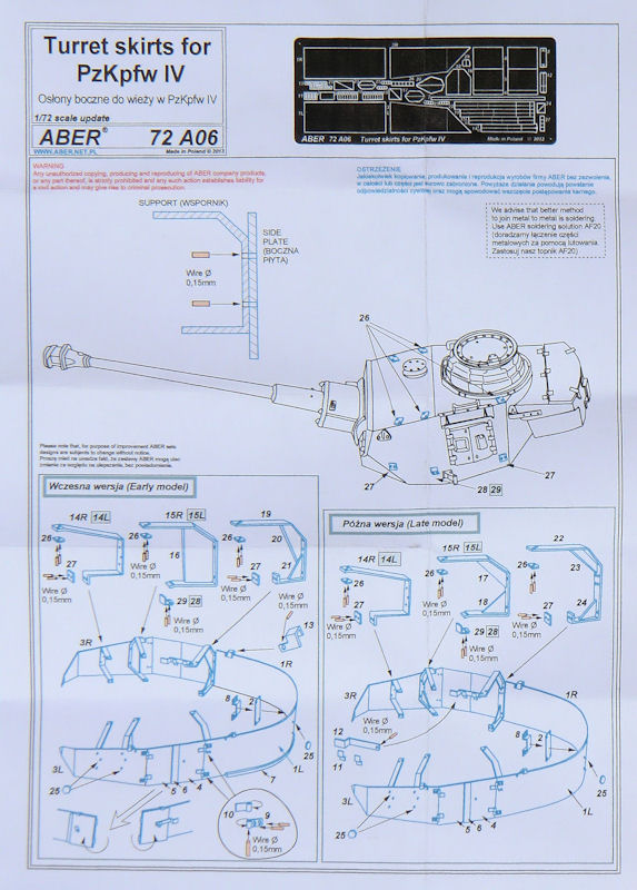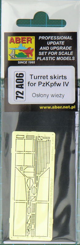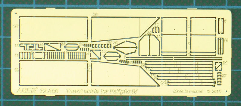 Für die verschiedenen Bausätze des PzKpfw. IV im Maßstab 1/72 hat ABER ein Fotoätzteilset zur Darstellung der Schürzen am Turm herausgebracht. Es ist universell und nicht auf einen Bausatz ausgerichtet. Die kleine Platine enthält alle notwendigen Teile um die frühe oder späte Ausführung der Schürzen zu bauen.