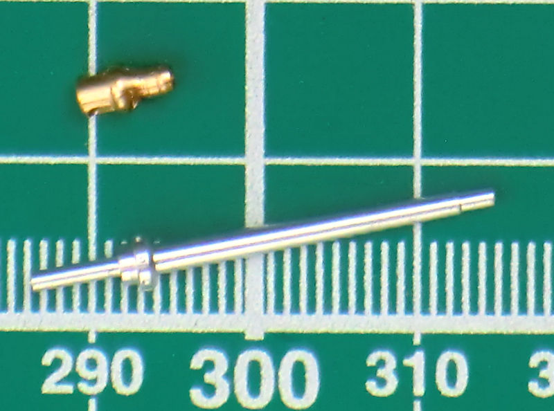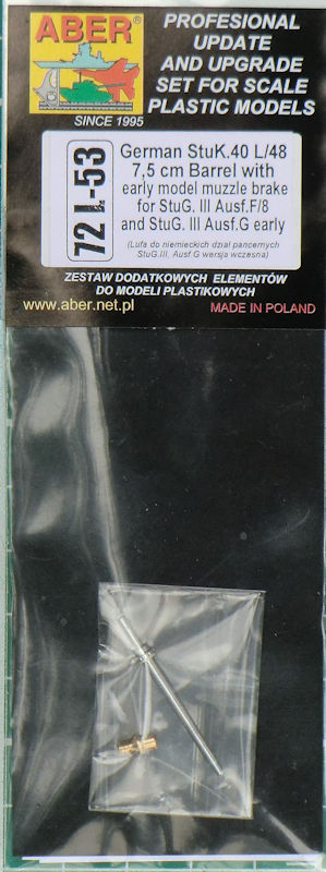 Für die verschiedenen Bausätze des StuG III F/G im Maßstab 1/72 hat ABER ein Detailset für die 7,5 cm Kanone L/48 herausgebracht. Es gibt ein Messingteil sowie eines aus Aluminium. Letzteres ist das eigentliche Rohr. Das ist auch zugleich das längste Teil. Die Mündung ist sehr komplex und entsteht aus einem Stück.