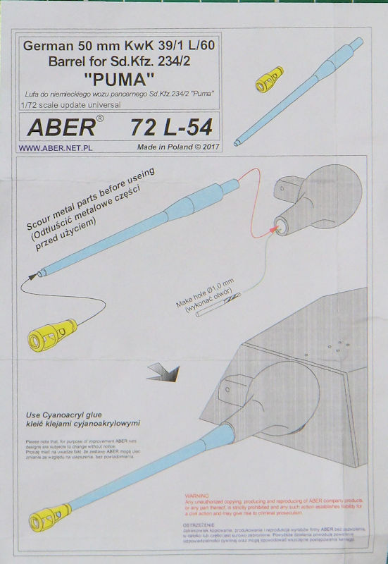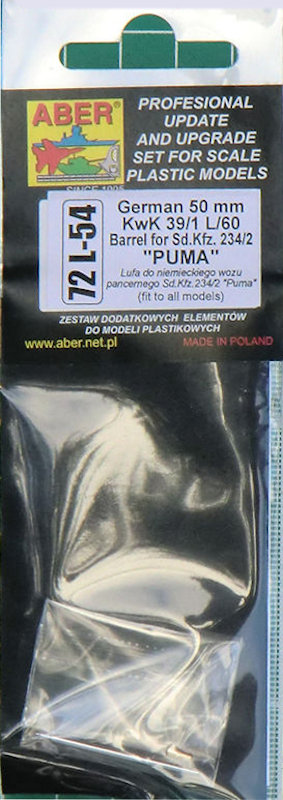 Für die verschiedenen Bausätze des Sd.Kfz. 234/2 Puma im Maßstab 1/72 hat ABER ein Detailset für die 5 cm KwK 39/1 L/60 herausgebracht. Es gibt ein Messingteil sowie eines aus Aluminium. Letzteres ist das eigentliche Rohr. Das ist auch zugleich das längste Teil. Die Mündung ist sehr komplex und entsteht aus einem Stück.