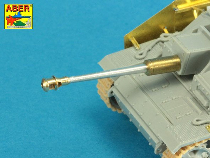 Für die verschiedenen Bausätze des StuG III G spät und des StuG IV früh im Maßstab 1/72 hat ABER ein Detailset für die 7,5 cm Kanone L/48 herausgebracht. Es gibt drei Messingteile sowie eines aus Aluminium. Letzteres ist das eigentliche Rohr. Das ist auch zugleich das längste Teil. Die Mündung ist sehr komplex und entsteht aus zwei Teilen.