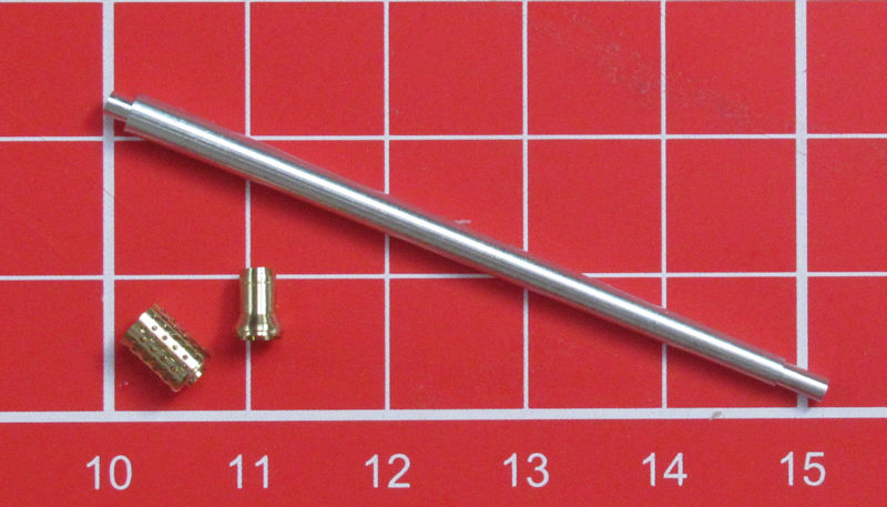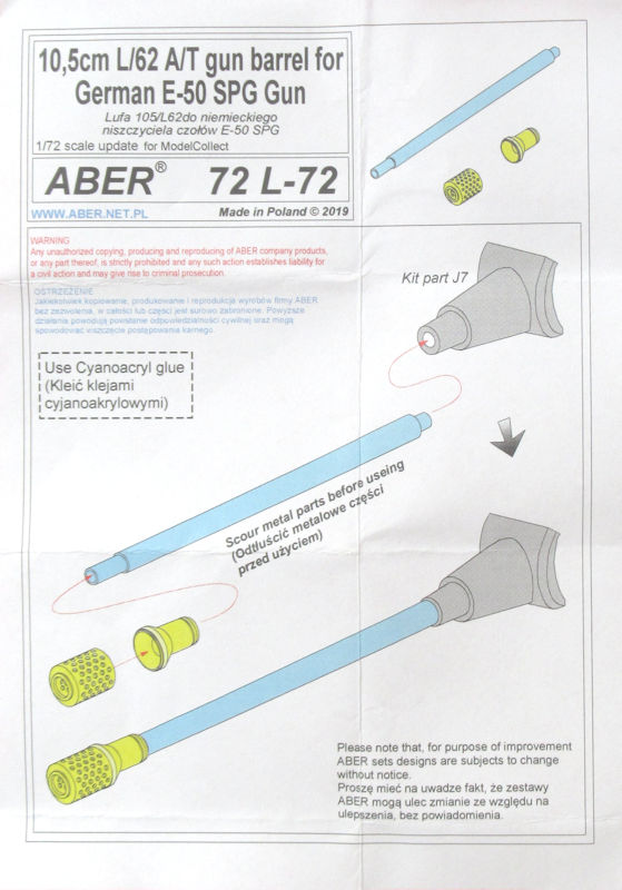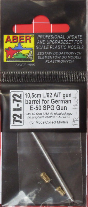 Für den Bausatz des E-50 SPG(Projekt - Wehrmacht 1946...) von modelcollect im Maßstab 1/72 hat ABER ein Detailset für die 10,5 cm Kanone L/62 herausgebracht. Es gibt zwei Messingteile sowie eines aus Aluminium. Letzteres ist das eigentliche Rohr. Die Mündung ist sehr komplex und entsteht aus zwei kleinen Messingteilen. Selbst die seitlichen Bohrungen sind durchbrochen.