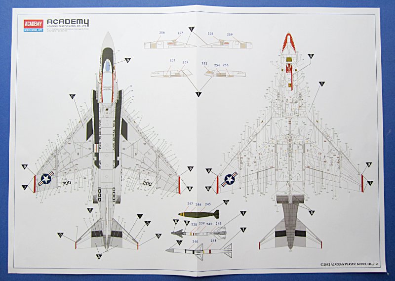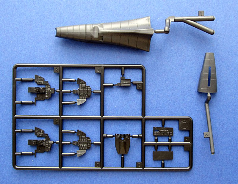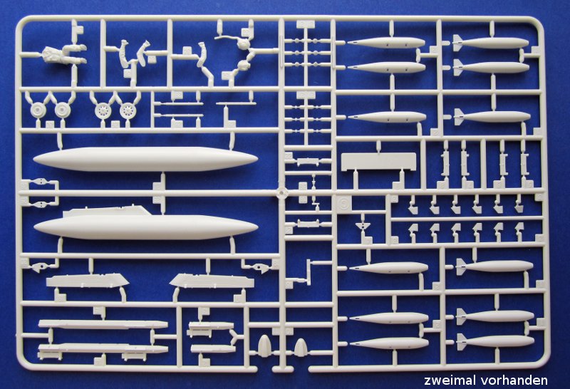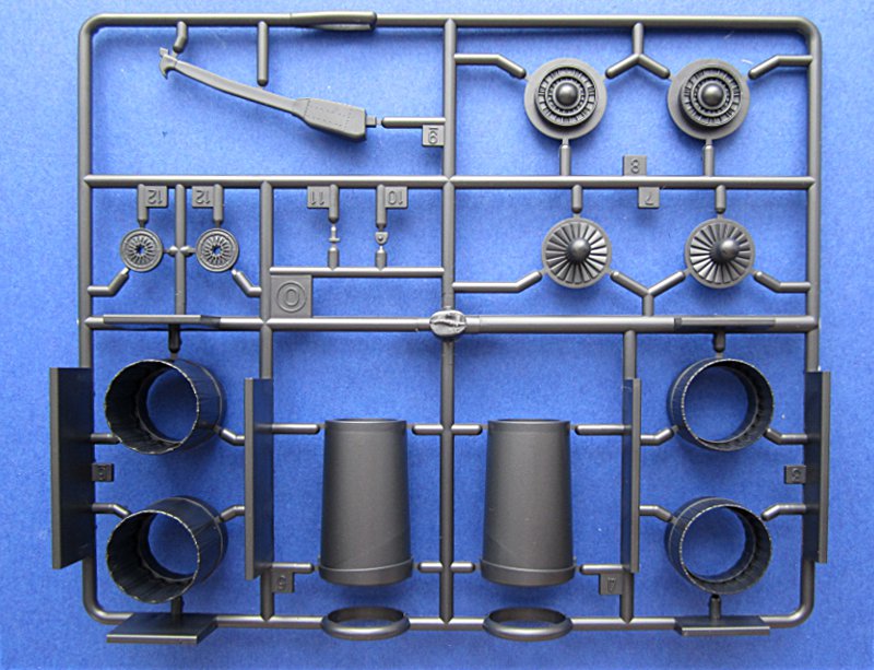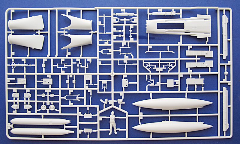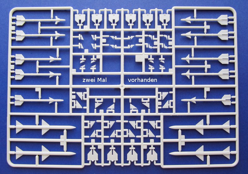 Die Lüfteinläufe müssen mehrteilig aufgebaut werden, aber immerhin enden die Einläufe nicht an einer Wand. Wer darauf keine Lust hat, findet auch bereits Abhilfe von Alleycat. Umfangreich ist die Beigabe von Waffen für die Phantom. Sidewinder, Sparrow, Mk.82 Bomben usw. sind in größerer Anzahl vorhanden (beide Spritzlinge doppelt). Vier Bewaffnungsvarianten sind auf einem separaten Blatt dargestellt. Den inneren Flügelpylon gibt es nur mit Startschienen und MER bzw. TER. Aerobonus bietet hier Abhilfe, falls dies nicht gewünscht ist.