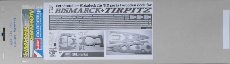 ACADEMY hat seit vielen Jahren die Bausätze der Tirpitz und Bismarck im Angebot. Die Tirpitz ist bei ACADEMY und auch Tamiya nur eine Bismarck in anderer Verpackung. Schaut man sich den Preis der ACADEMY-Bismarck an, so bekommt man für knapp 37 € eine Menge Modell in 1/350.