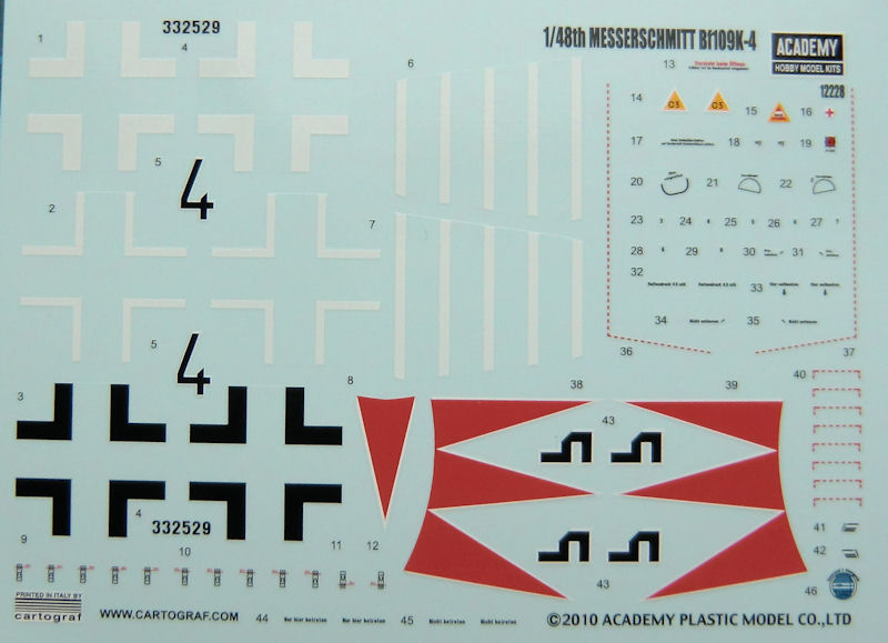 Für die Lackierung ist eine Me-109 K-4 des Stabs-Jagdgeschwaders 52, stationiert in der damaligen Tschechoslowakei im Mai 1945 vorgesehen. Auffällig ist das große rote Tulpenmuster am Bug, welches auch als Decal vorhanden ist. Die Abziehbilder sind wieder bei Cartograf gedruckt.
