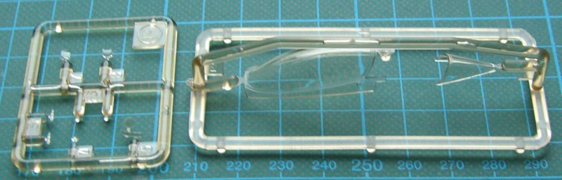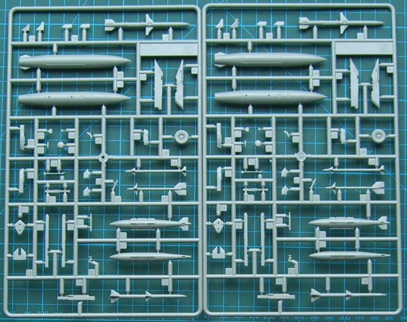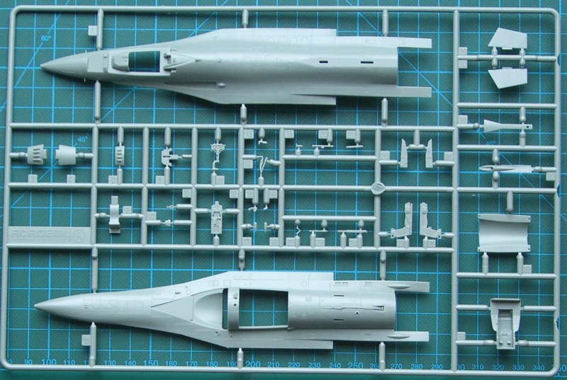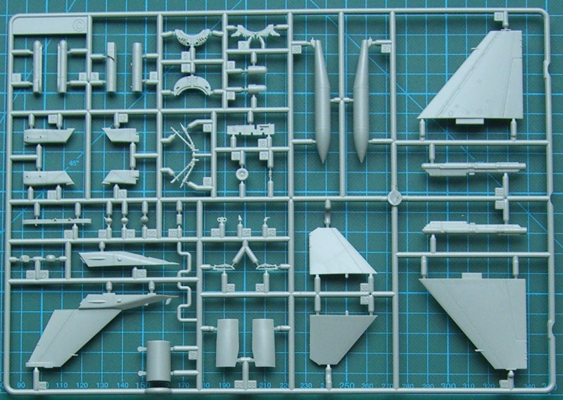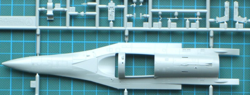 Insgesamt liegen vier graugrüne Spritzlinge und zwei getönte für die Klarsichtteile in drei Hüllen für den Modellbauer bereit. Für das Cockpit fällt der besonders gut gestaltete Sitz aus fünf Teilen auf. Zwischen der Wanne und dem oberen Rumpfteil sind Segmente anzubringen, damit der geschlossene Eindruck entsteht. Instrumente sind hier ebenso angedeutet wie auf den Seitenteilen der Wanne. Für das strukturierte Frontteil gibt es kleine Decals für die Bildschirme. Ein separater Joystick fehlt ebenfalls nicht. Der Lufteinlauf ist hinreichend lang ausgestaltet, was auch für den Triebwerksauslas gilt. Besonders sorgfältig sind die Fahrwerke sowie deren Schächte und Klappen gestaltet, in bisher in diesem Maßstab unbekannter Detaillierung.