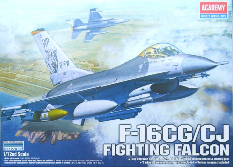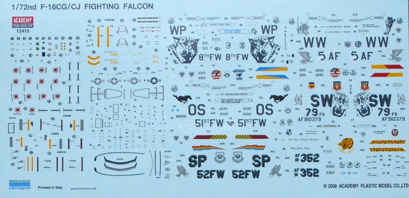 Eine F-16 gehört einfach dazu, mag man sich bei ACADEMY gedacht haben; oder der US-Markt verlangt danach und schließlich fliegen die Koreaner den Fighting Falcon ja selbst. Jedenfalls hat man keine Mühe gescheut, um einen guten Bausatz in den Kasten zu legen. Es beginnt mit dem attraktiven Kartonbild und endet mit dem wirklich als super zu bezeichnenden Decals vom Italiener CATOGRAF für sage und schreibe fünf Versionen, die Maschinen repräsentieren, die in Deutschland, Japan, Korea und in den USA stationiert waren, von 2002 bis 2005.