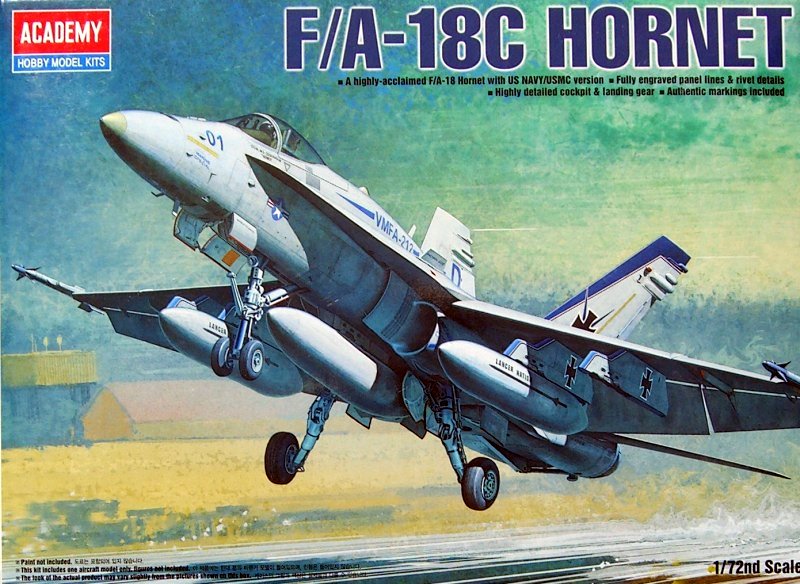 Das Kartonbild zeigt eine Hornet im Landeanflug mit ausgefahrenen Klappen. Leider gestattet der Bausatz, wie alle 1/72er Modelle, diese Konfiguration nicht. Schade! Der Rumpf ist horizontal geteilt. Die Rumpfspitze ist als Konusteil d.h. als eigene Komponente ausgeführt. Für die vordere Unterseite sind jedoch zwei Einzelteile vorgesehen. Der Sinn dieser Gestaltung ist nicht erkennbar.