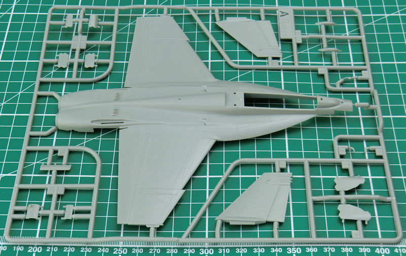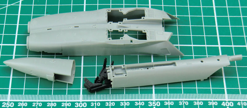 Die Abspritzung der Bauteile ist toll und angesichts des Konzeptes kann auch der fortgeschrittene Modellbauer mit den mehrfarbigen Teilen leben. Alle Teile lassen sich im Prinzip ohne Klebstoff zusammenfügen. ACADEMY hat auch auf scharfe Hinterkanten bei Ruder und Tragfläche gedacht. Der Bau beginnt mit den Teilen für Rumpf, Tragfläche und Triebwerken samt Hauptfahrwerk. Dann folgt erst das Cockpit. Die Schleudersitze sind recht rustikal und sollten mit ein paar Gurten versehen werden. In der Cockpitwanne findet man schöne Details die noch sinnvoll bemalt werden sollten. Für die Instrumentenbretter gibt es noch gut gemachte Decals. Leider ist die Kanzel einteilig und bleibt nach dem Zusammenbau zu.