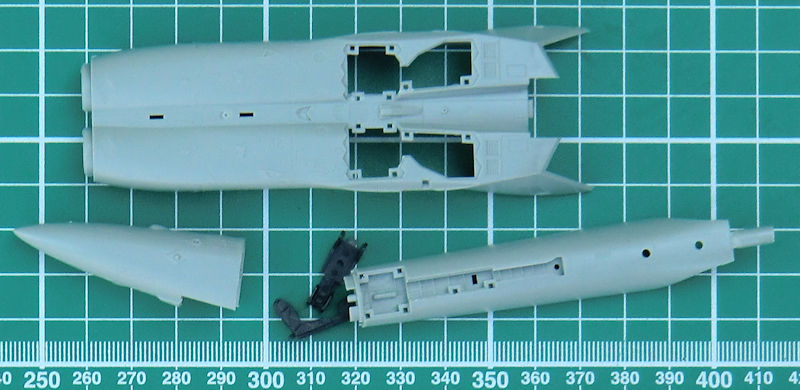 In der einzelnen Rumpfstpitze sollte man bisschen Gegengewicht unterbringen, denn einen Ständer wie bei der F-16 gibt es nicht. Dafür ist das Fahrwerk auch sehr schön detailliert obwohl es aus wenigen Teilen besteht. Die Nachbrenner sind schwarz und sind in geschlossener Position.