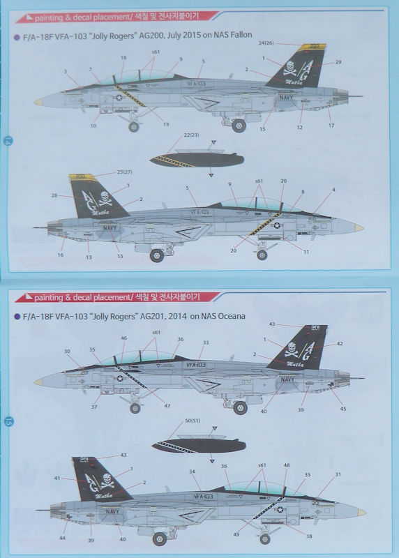 Die Farbangaben sind sehr vollständig aber sehr winzig abgedruckt. Sie sind für die Farbsysteme von Humbrol, GSI, Modelmaster, Revell und Vallejo. Die Decals sind sauber auf hellblauen Trägerpapier gedruckt.