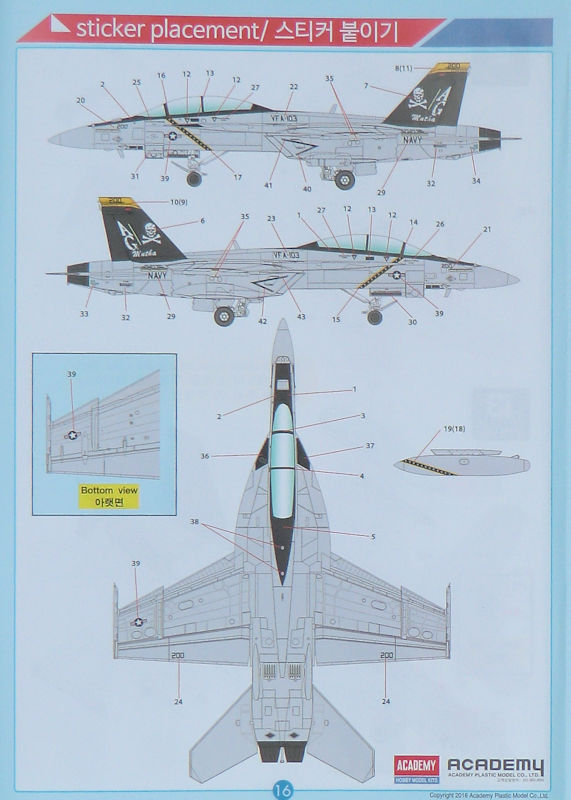 Bausatz: Noch eine F/A-18F in 1/72 werden manchen sagen. ACADEMY liefert hier allerdings einen "intelligenten Easykit" für den Einsteiger. Dieser kann auch als normaler Bausatz gebaut und je nach Möglichkeiten nachdetailliert werden. Dafür gibt es mehrfarbig abgespritzte Rahmen, Sticker und auch Decals zur Detaillierung. In dem stabilen Stülpkarton befinden sich gut verpackt sieben graue Spritzlinge oder Großbauteile (62 Teile), ein schwarzer Spritzling (15 Teile), ein weißer Spritzling mit zehn Teilen, zwei Klarsichtteile, ein Bogen mit Sticker, ein Decalbogen und die mehrfarbige Bau- und Bemalungsanleitung.