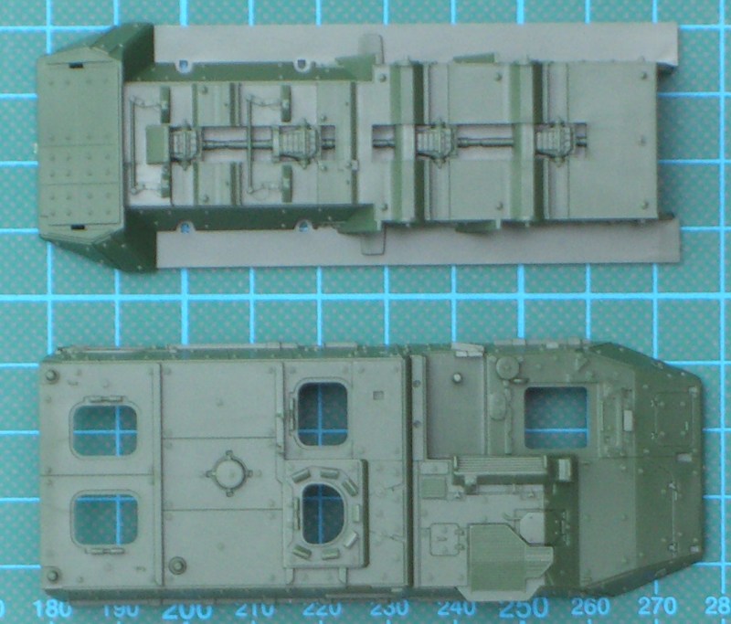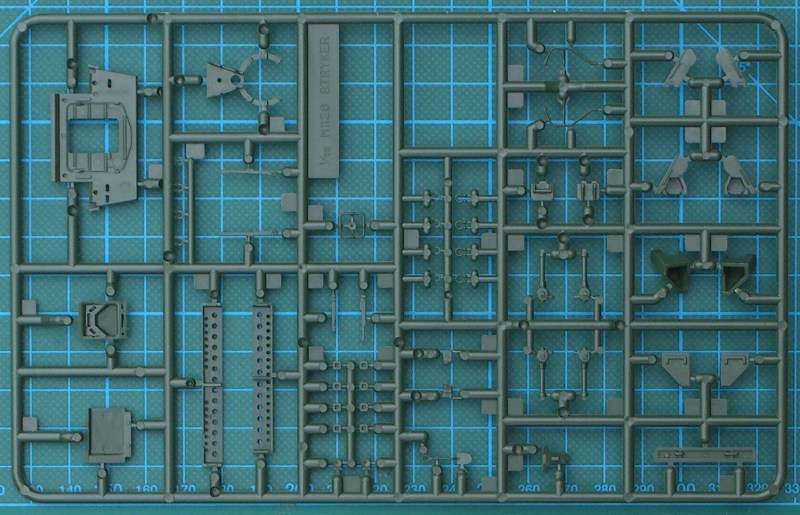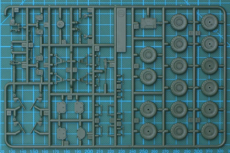 Der stabile (modellbaufreundliche) Karton enthält zwei dunkelgrüne Spritzlinge sowie zwei Bauteile für die Fahrzeugober- und -unterseite. Wie bei ACADEMY üblich gibt es nichts an der Detaillierung auszusetzen. Man erkennt die Qualität des koreanischen Formenbaus! Die Fahrzeugunterseite ist sehr gut detailliert und dort müssen nur die Achsschenkel ergänzt werden. Die Räder bestehen aus zwei Hälften und sind nicht abgeplattet.