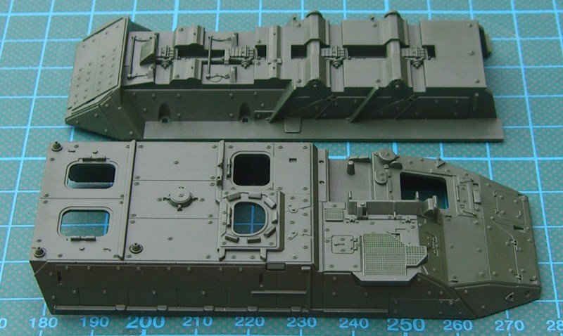 Auf der Oberseite werden die Einstiegs- / Ausstiegsklappen separat montiert. Das gilt ebenso für die am Heck befindliche Klappe. Da hat man bei ACADEMY gut mitgedacht. Der kleine Decalbogen ist ohne Versatz auf hellblauem Trägerpapier gedruckt.