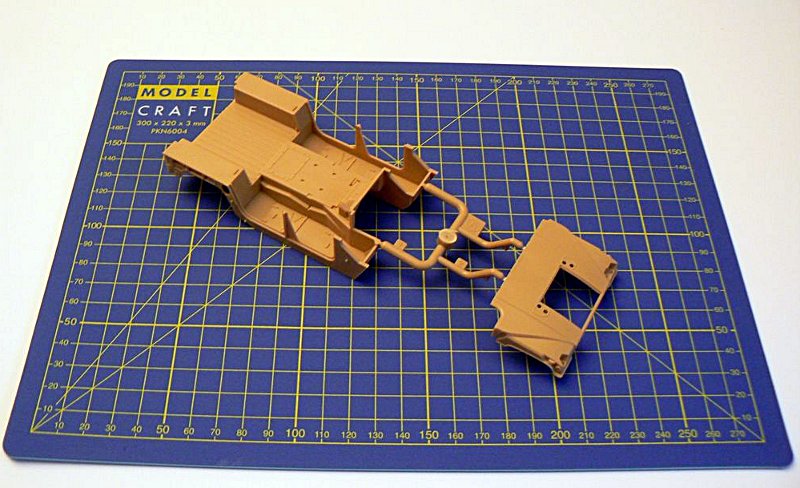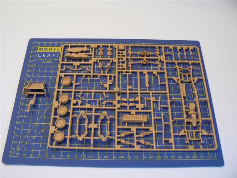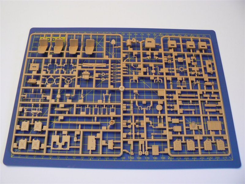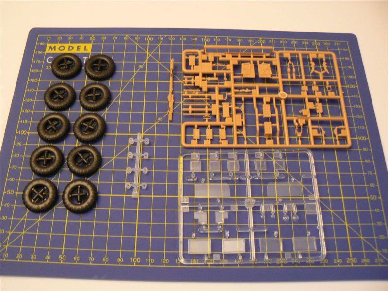 Das einzige, was mir bei diesem Modell etwas missfällt, sind die jeweils zweiteiligen Spritzgussreifen. Leider fehlen auf diesen auch die Reifenhersteller Beschriftungen. Ich hätte gut gemachte Gummireifen besser gefunden. Im Bausatz befindet sich noch eine kleine Platine sinnvoller Ätzteile, ein paar Kanister und zwei gut modellierte Figuren.