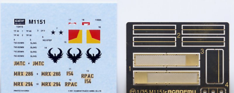 Decals und Bemalung: Der Bauplan ist gut gestaltet und mit dem Decalbogen lassen sich zwei Fahrzeuge in Wüstentarn und ein Fahrzeug im Dreifarben Nato Tarnanstrich mit diesen versehen. Leider Gibt der Bauplan keine Auskunft auf die Einheiten in der die Fahrzeuge im Einsatz sind. Academy gibt 4 verschiedene Farbhersteller an.