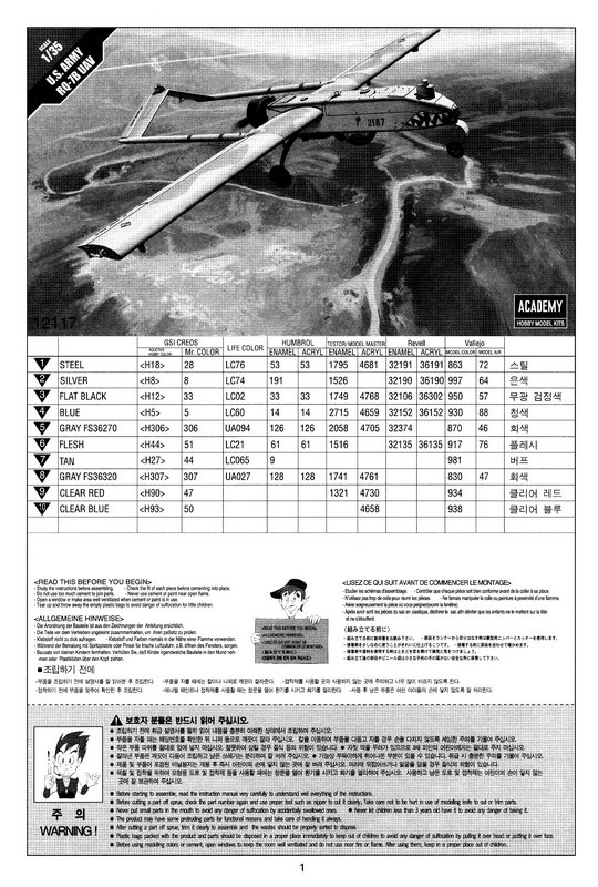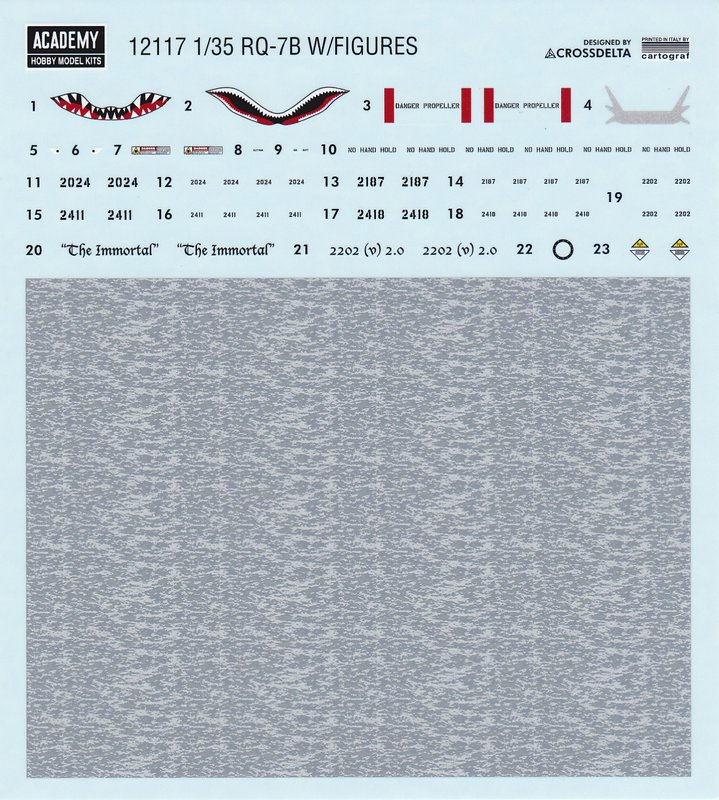 Decals und Lackierung: Der hervorragend gedruckte kleine Decalbogen erlaubt den Bau von vier Varianten der Drohne. Darunter befinden sich drei amerikanische und eine der südkoreanischen Armee. Auf sechs verschiedene Farbenhersteller wird hingewiesen. Sehr lobenswert ist die Auflistung der Email - oder Acrylfarben mit FS – Nummern.