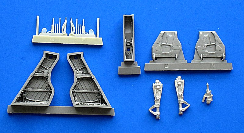 Dieser Satz ersetzt die Fahrwerksschächte im Flügel und im Bug. Die Resinteile sind mal wieder von höchster Gussqualität. Alle Details sind schaft abgebildet und es gibt nirgends Blasen oder Lunker. In die Schächte müssen nur wenige Teile zusätzlich eingebaut werden, da Vieles schon angegossen ist. Auch die Metallfahrwerksbeine sind sehr schon gestaltet (mit Bremsleitungen) und haben keine Formtrennnaht. Entweder wurde diese nach dem Guss versäubert oder der Guss selbst ist so gut.
