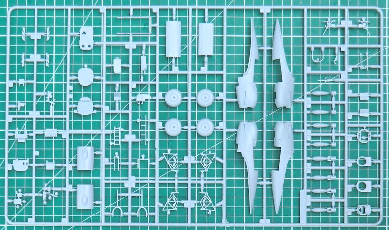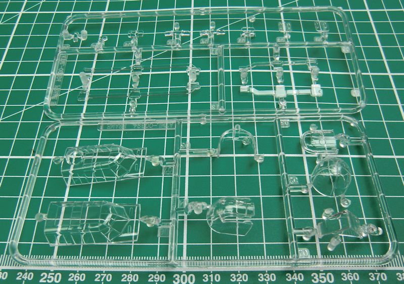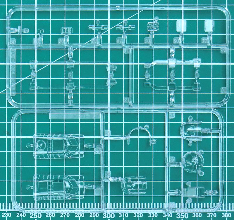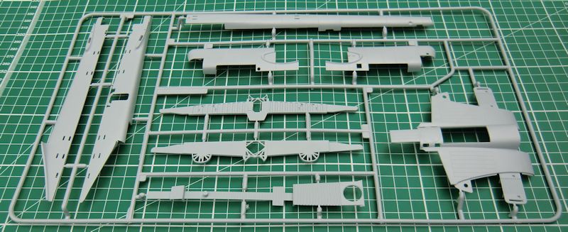 In dem attraktiven Stülpkarton befinden sich gut verpackt vier hellgraue Spritzlinge mit 136 Einzelteilen, zwei klare Spritzlinge mit 19, ein Decalbogen und die mehrfarbige Bau- und Bemalungsanleitung. Die Abspritzung der Bauteile ist sehr gut und auch die versenkten Strukturen sind recht tief und schmal. Der äußere Rumpf ist in fünf Teile zerlegt. Damit können andere Versionen recht einfach entstehen. Angekündigt sind ja die Mk. VII und eine Transporterversion.