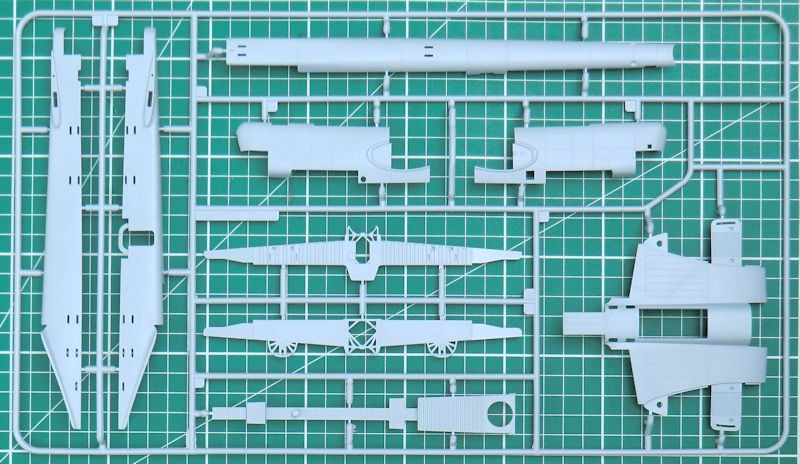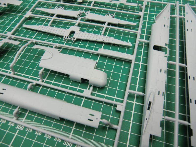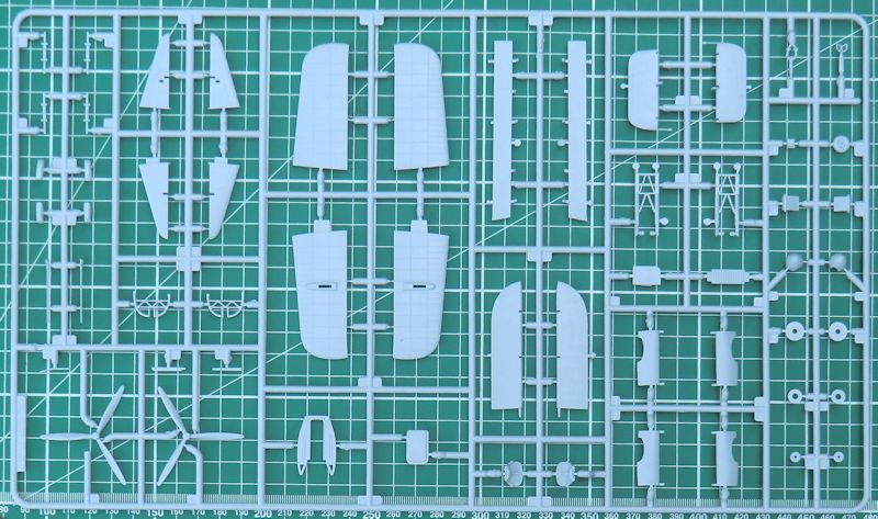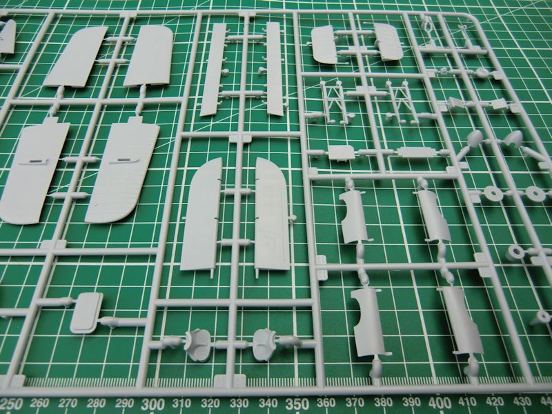 Bei den beiden Abwehrtürmen gibt es schöne Details und hier gibt es kaum Raum für Verbesserungen. Gedrehte Metallrohre wären so eine Maßnahme… Die dreiblättrigen Luftschrauben bestehen aus jeweils einem Stück. Für die große klare einteilige Cockpitverglasung gibt es Alternativteil. Die Einstiegsklappe im Bug kann offen angeklebt und mit einer Leiter versehen werden.