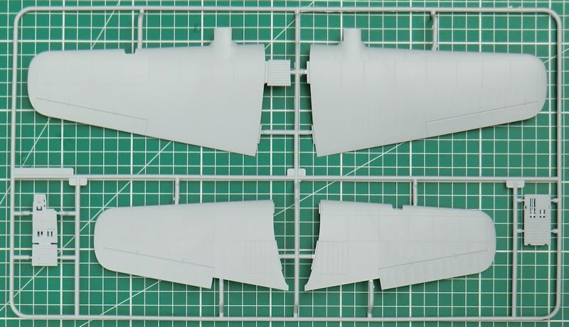 Nacheinander werden Rumpfvorderteil und das Heck an die Tragfläche angeklebt (!). Die Landeklappen können auch in ausgefahrener Position angeklebt werden. Hier bietet eduard eine fotogeätzte Alternative an. Seiten- und Höhenruder haben scharfe Hinterkanten. Die beiden Bombenschächte können offen bleiben und mit Bombennachbildungen bestückt werden. Um die Bomben weitergehend detaillieren zu können, biete eduard auch diverse geätzte Teile an. Das Fahrwerk nimmt die gute Detaillierung der Schächte auf. Die Hauptfahrwerksräder sind abgeplattet.