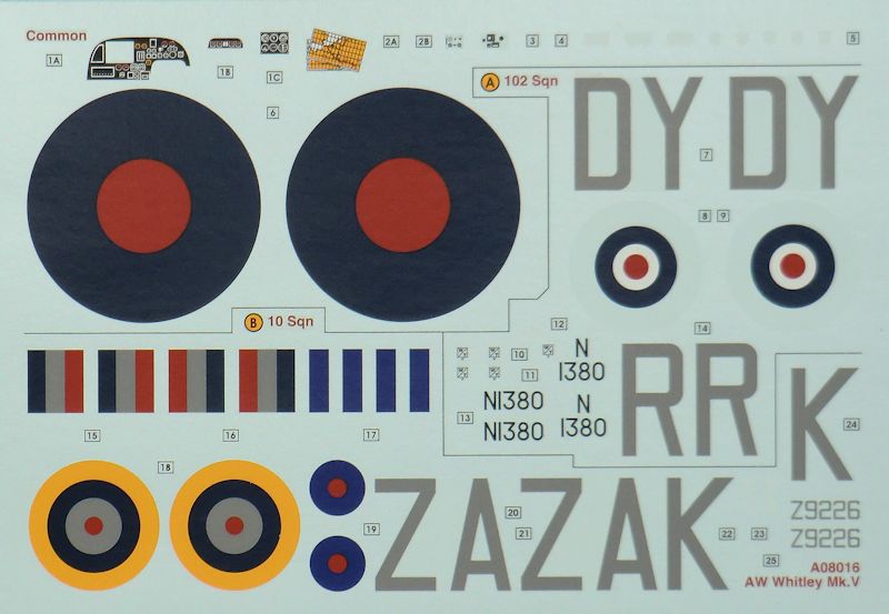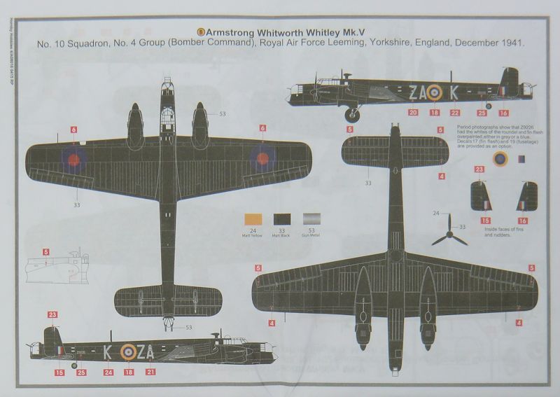 Bausatz: Die Armstrong Whitworth Whitley Mk. V gab es viele Jahre in 1/72 nur von FROG und später von NOVO. Dann folgte Anfang 2012 bei Fly ein anspruchsvoller Short-Run-Bausatz. Ergänzt wurden diese dann durch die in den Dimensionen abweichenden früheren Versionen. Airfix überraschte mit seiner Ankündigung einer neuen Whitley schon. Es wird im nächsten Jahr noch weitere Versionen geben.