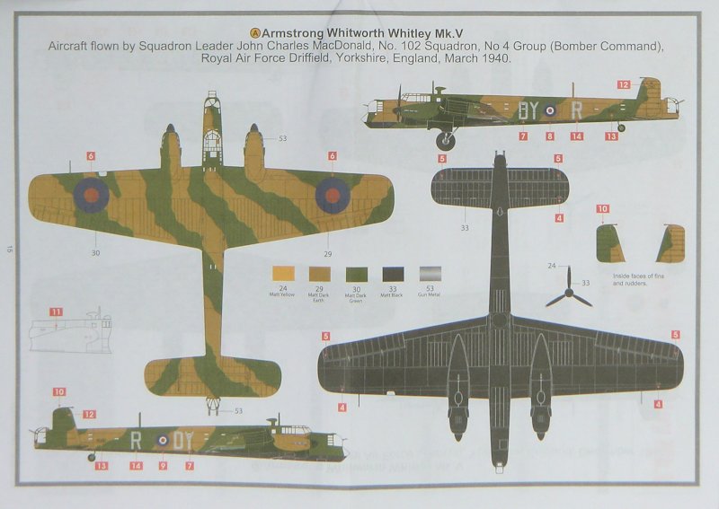 Vorbild: Die zweimotorige Armstrong Whitworth Whitley war ein schwerer Bomber der RAF aus der Anfangszeit des WK II und entstand aufgrund einer Ausschreibung der RAF(B.4/34) von 1934. Der Erstflug des mit K4586 gekennzeichneten Prototyps war am 17. März 1936. Die ersten Exemplare der Whitley waren bis einschließlich der Mk. III waren mit Armstrong Siddeley Tiger-Sternmotoren ausgerüstet. Insgesamt sollten 320 Exemplare dieses bei der Indienststellung schon fast veraltenden Entwurfs gebaut werden. Dann wurde der Auftrag auf nur 200 Stück gekürzt, die bis zum März 1939 geliefert werden sollten.