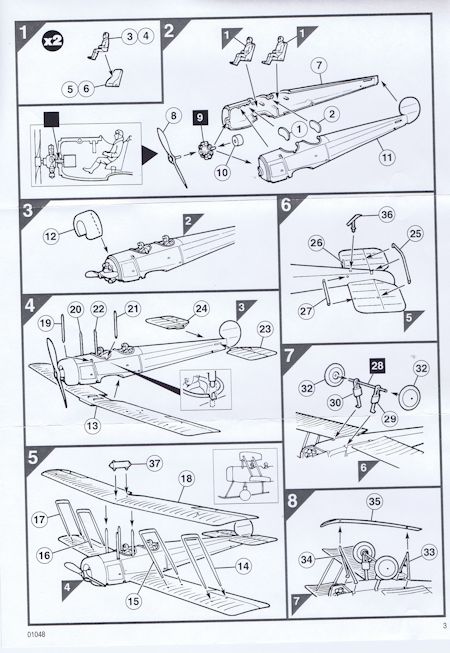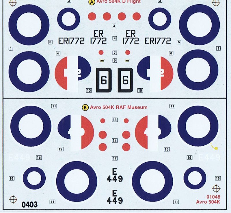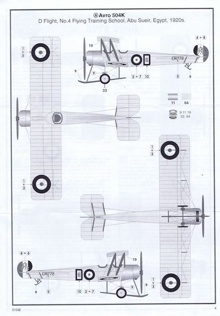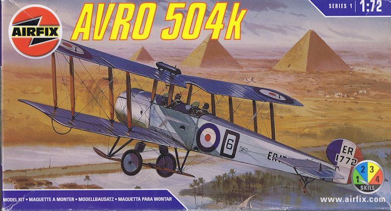 Vorbild: Die Avro 504, die 1913 zum ersten Mal geflogen wurde, wurde vom RFC (Royal Flying Corps) als Standardschulflugzeug übernommen. Ihr erster Einsatz war die Teilnahme an einem Bombenangriff auf Zeppelinhallen am Bodensee. Ab 1917 gehörte sie zur Ausstattung der Sonderflugschule "Smith-Barry School of Special Flying". Auf das frühe "J" Modell folgte 1918 die Ausführung "K". Der gesamte Produktionsumfang betrug 8340 Maschinen. Die späteren Versionen N und S blieben bis in die 30er Jahre im aktiven Dienst. Angetrieben wurde sie durch einen 110 PS Le Rhone, 130 PS Clerget oder 100 PS Monosoupape Motor. Als Zweisitzer hatte sie bei drei Stunden Flugdauer eine Höchstgeschwindigkeit von 152 km/h. Sie hatte keine Bewaffnung. (Text: Airfix)