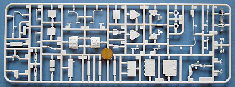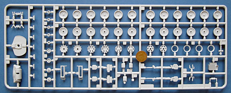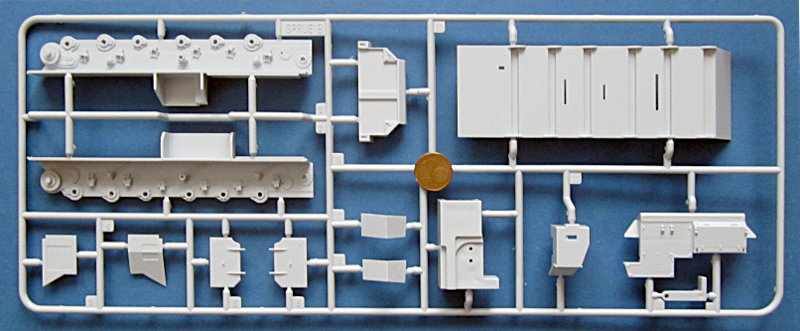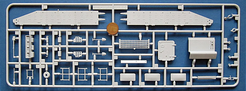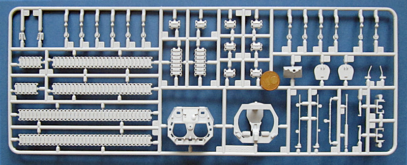 Die Schwingarme sind einzeln anzukleben. Mit etwas Aufwand lassen sich diese sicher auch an ein Terrain anpassen. Demgegenüber steht aber die Plastikkette, die aus kürzeren und längeren Segmenten aufgebaut wird. Solche gefallen mir persönlich viel besser als Gummi oder Einzelgliedketten, lassen sich aber nur schwer an „Bodenunebenheiten“ anpassen. Der Aufbau erfolgt einfach anhand Bauanleitung. Die aufgeprägten Details sind gut gemacht. Einige sind aber wie schon erwähnt etwas voluminös. Leider lässt sich aus dem Bausatz nicht ohne größeren Aufwand eine frühe Variante bauen, so dass man nicht auf die Gitter verzichten kann. Die Komplexität ist insgesamt überschaubar, erhöht sich aber natürlich mit Verwendung des Ätzteilsatzes.