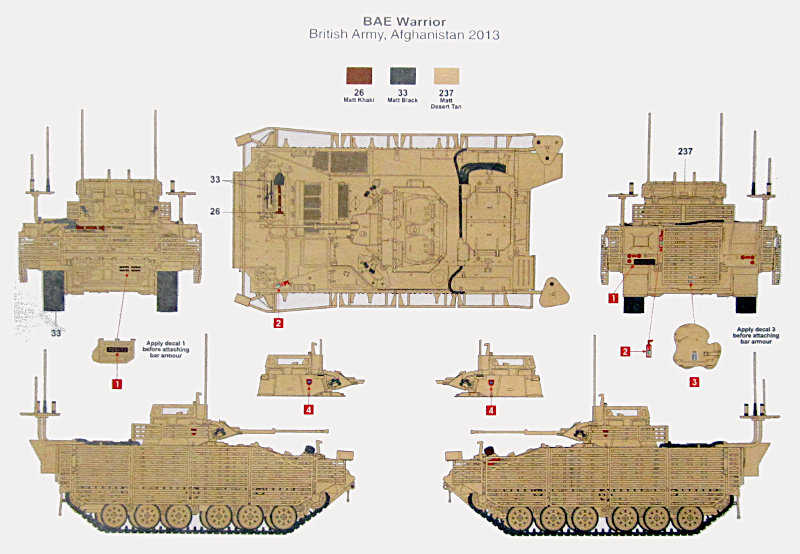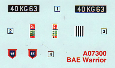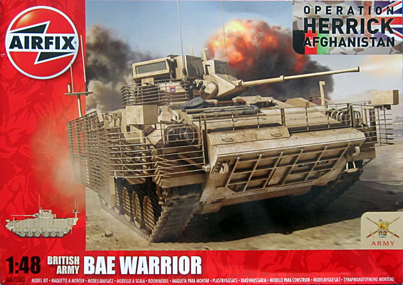 Bausatz: Im Zuge seiner „Operation Herrick“ Reihe hat Airfix als größten Bausatz den Warrior herausgebracht. Im großen Karton finden sich 7 Spritzlinge, die diesen nicht ganz ausfüllen. Die Abspritzung ist gut, wie von Airfix in dieser reihe gewohnt. Die Details sind eher etwas einfach und grob, aber keineswegs schlecht. Mit dem hauseigenen PE Satz (produziert von Eduard) kann man auch noch einige Details hinzufügen bzw. Aufwerten. Der einzige deutliche Schwachpunkt sind die Gitter. Dies geht auch in Plastikspritzguss besser, wenn auch nicht vorbildtreu. Ich habe Eduard bereits vorgeschlagen in der neuen Stahlätzteilreihe einen Satz für den Warrior zu produzieren, leider ohne Erfolg.