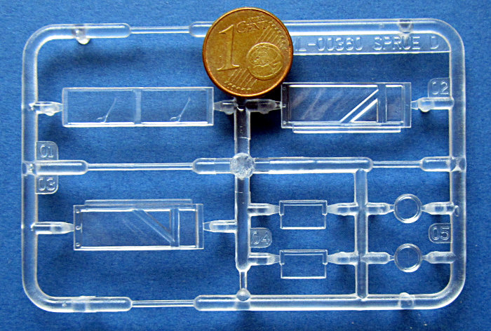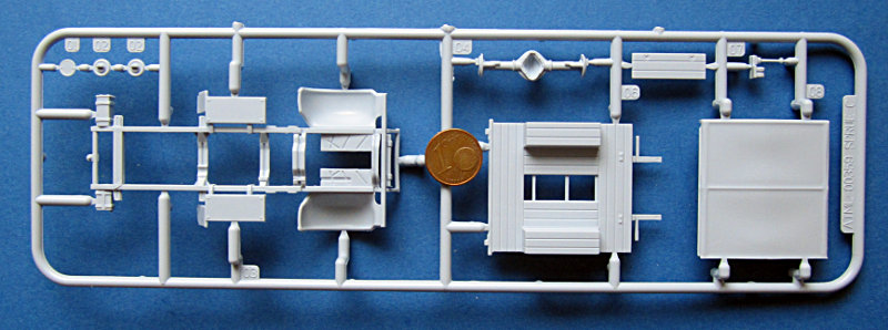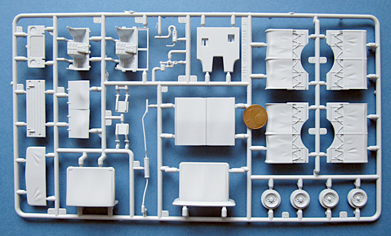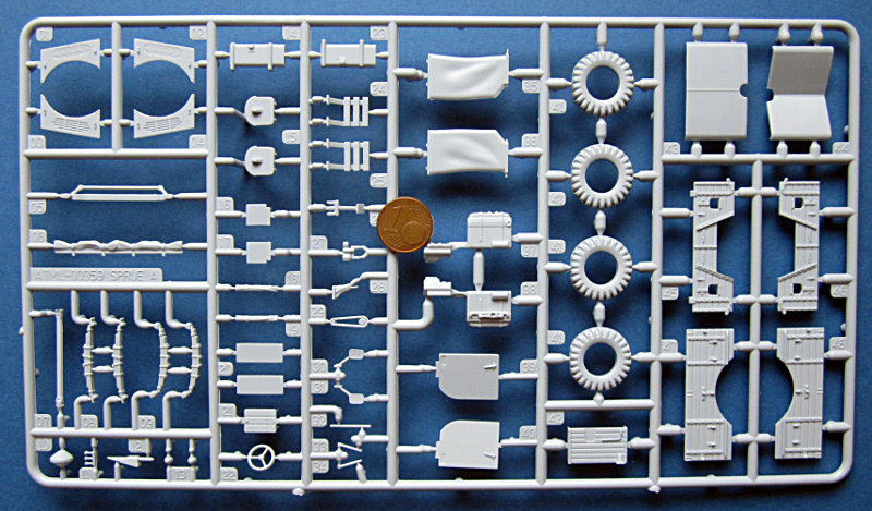 Die seitliche Motorraumverkleidungen der beiden Varianten ist unterschiedlich und liegt jeweils separat bei. Diese kann man auch weglassen, da etliche Fahrzeuge (britisch und Beute) auch ohne die seitlichen Bleche, sowie einige auch ohne Motorhaube im Einsatz fuhren. Die Motorhaube kann auch einseitig geöffnet dargestellt werden (separates Teil). Die Motordarstellung ist ganz o.k., stellt aber wohl ein Nachkriegsfahrzeug dar. Vielleicht gibt es ja einen Zubehörhersteller, der sich dieses Bereichs annimmt. Die Scheinwerfer können mittels Klarteilen, als Tarnscheinwerfer oder der rechte abgedeckt und mit Gewichtsklassenmarkierung versehen dargestellt werden.