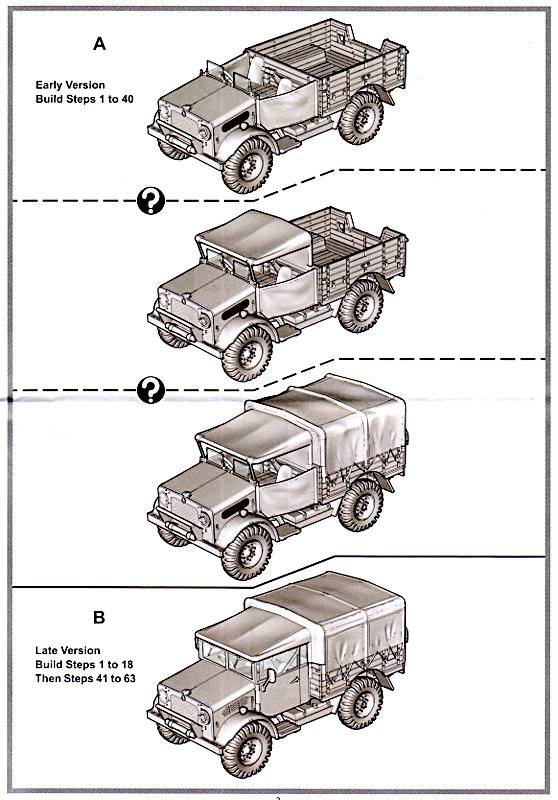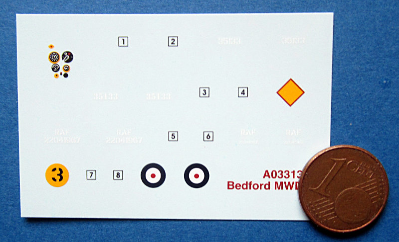 Zwei Bemalungsvarianten sind vorgesehen. Ein frühes Fahrzeug der Britschen Armee in helloliv, dunkelgrün und khaki und ein spätes Fahrzeug der RAF in dark earth (Planen khaki). Der kleine Decalbogen enthält die dafür notwendigen Markierungen. Mit etwas Recherche lässt sich aber eine breite Palette von britischen Fahrzeugen oder Beutekfz. darstellen