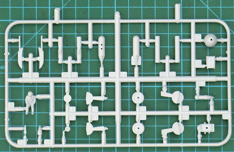Im Karton befinden sich die Bauanleitung mit zwei toll gemachten mehrfarbigeb Bemalungsanleitungen, der Decalbogen, zwei Klarsichtteile, drei Spritzgussrahmen mit insgesamt 39 Teilen. Schnell wird klar: Dieses ist ein Bausatz für Anfänger! Das Cockpit ist rudimentär und eine Pilotenfigur füllt es ganz gut aus. Es gibt tatsächlich nur noch einen Sitz und das war es.