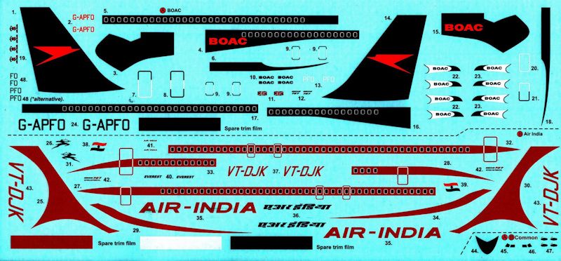 Es gibt die Nassschiebebilder für zwei Airlines, BOAC und Air India, wobei die Fenster und Silberrahmen gleich mitgedruckt sind. Hier ist Airfix von seiner üblichen Strategie abgewichen. Früher gab es einen Decalstreifen, aus dem man dann die Fenster ausstanzen konnte. Jetzt muss man die offenen Fenster verspachteln um die Decals verwenden zu können. Mir persönlich sind die Fenster zu hellgrau gedruckt. Alle nötigen Decals sind dabei, um die Airlines darzustellen. Weitere Detaildecals gibt es nicht.