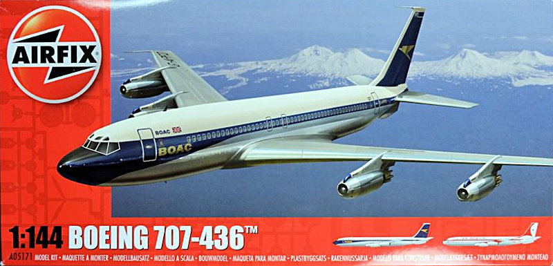 Vorbild: Die Boeing 707 basiert auf dem Prototyp 367-80. Ausgangspunkt der zivilen Version war die Bestellung von zunächst 29 Fracht-/Tankflugzeugen Boeing C-135 durch die US-Luftwaffe. Um jedoch sechs Sitze nebeneinander in der Kabine anordnen zu können, musste der Rumpf der 707 im Vergleich zur 367-80 um rund 10 Zentimeter geweitet werden. Der Erstflug der 707 erfolgte am 20. Dezember 1957. Das erste Düsenverkehrsflugzeug von Boeing erzielte weltweit einen durchschlagenden Markterfolg, auch gegen die konkurrierende DC-8.