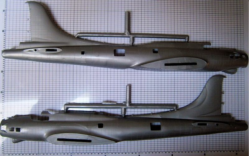 Die Passgenauigkeit lässt bei so alten Formen oft zu wünschen übrig, weil sich Rumpf- und Tragflächenhälften verzogen haben können. Die Klarsichtteile können ebenfalls den heutigen Standard nicht erreichen. Der Zusammenbau ist nicht besonders aufwändig, weshalb die übersichtliche Bauanleitung mit zehn Bauschritten auskommt. Man sollte also recht schnell zum Ziel gelangen, wenngleich viel Zeit für das Entgraten einzuplanen ist! Anfänger, die sich damit nicht so lange aufhalten, sind dagegen an einem Wochenende mit ihrer Fliegenden Festung fertig. Die Gießrahmen wurden passenderweise auch schon Aluminiumfarben abgespritzt, was dem Einsteiger auch bei der Lackierung weiterhilft.
