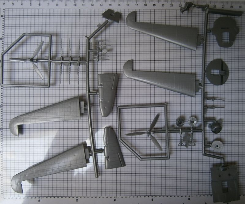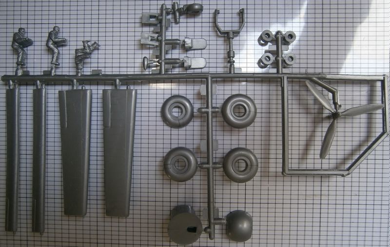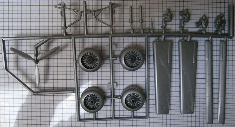 Der Bausatz besitzt insgesamt gut 100 Teile. Auch der Cockpitbereich hat eine Grundausstattung, die sich sehr gut als Basis für eine weitere Detaillierung eignet. Die Kleinteile wurden nicht allzu grob ausgeformt, lediglich die drei Positionsleuchten an der Wurzel der Seitenleitwerksfinne sind enorm groß ausgefallen und sollten am besten entfernt werden! Für die Waffentürme und Gefechtsstände stehen Figuren zur Verfügung, die filigran und korrekt nachgebildete Browing-MG bedienen. Auch das Fahrwerk ist nicht mal so übel, weil die Felgen der Haupträder bereits Oberflächenstrukturen besitzen, darüber hinaus kann alles auch noch eingefahren dargestellt werden. Die Fugen der Kühlerklappen an den Cowlings sind leider erhabenen dargestellt, was beim Bausatz der DC-3 besser gelöst wurde. Die Turbolader an den Triebwerken sind ebenfalls etwas einfach ausgefallen.