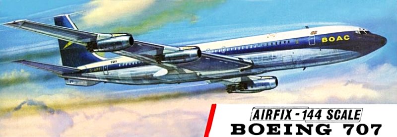 Vorbild: Die Boeing 707 basiert auf einem Boeing-Prototyp, der Boeing 367-80. Ausgangspunkt der zivilen Version war die Bestellung von zunächst 29 Fracht-/Tankflugzeugen des Typs Boeing C-135 durch die US-Luftwaffe. Um jedoch 6 Sitze nebeneinander in der Kabine anordnen zu können, musste der Rumpf der 707 im Vergleich zur 367-80 um rund 10 Zentimeter geweitet werden. Der Erstflug der 707 erfolgte am 20. Dezember 1957. Es war das erste Düsenverkehrsflugzeug von Boeing und erzielte weltweit einen durchschlagenden Markterfolg, auch gegen die konkurrierende Douglas DC-8.