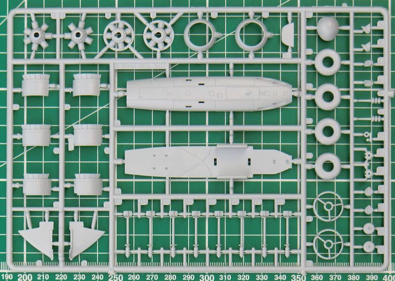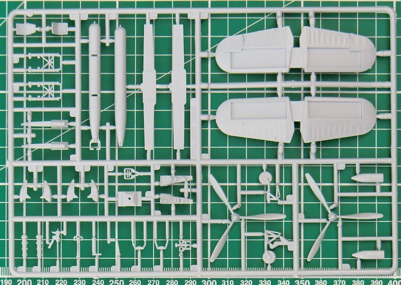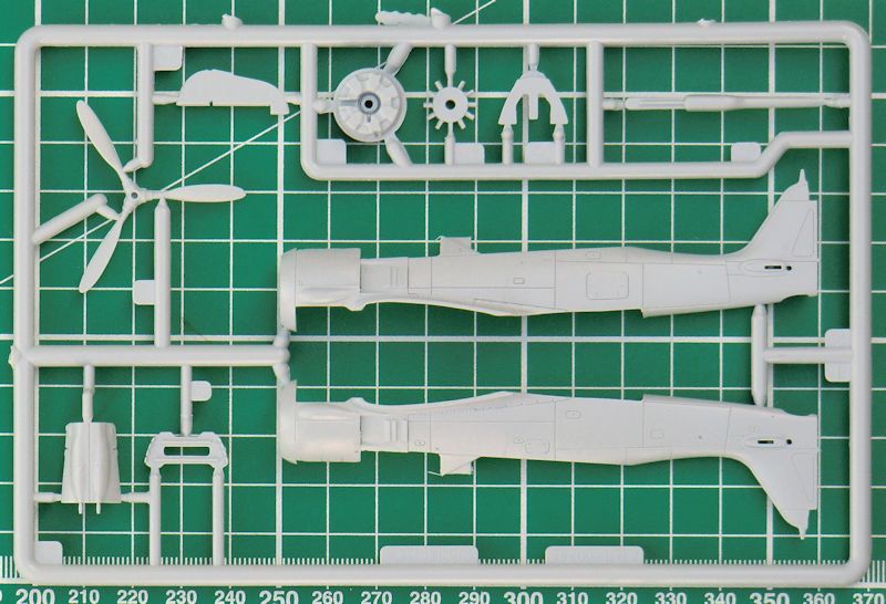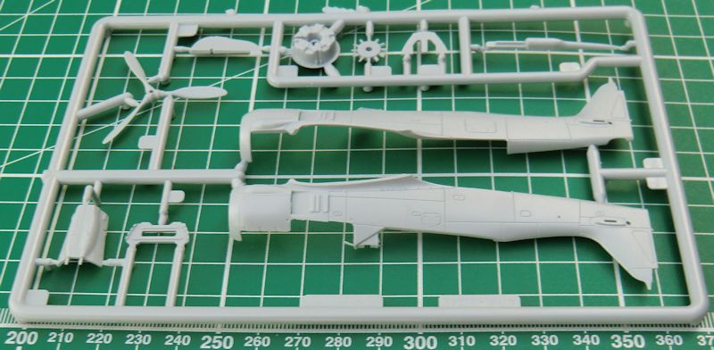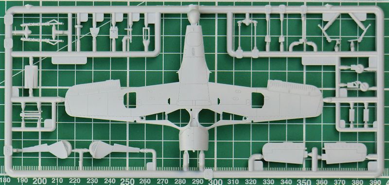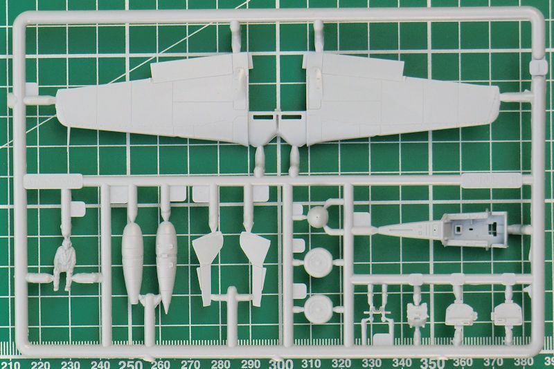 Das Seitenruder besteht aus einem Stück. Das gilt auch für die beiden Hälften des Höhenleitwerks. Die Rohre der Flügelwaffen werden einzeln eingeklebt. Auch auf der Rumpfoberseite gibt es im Bugbereich oben zwei Einsätze. Das Fahrwerk kann ein- oder ausgefahren dargestellt werden. Dafür gibt es jeweils separate Teile. Das ausgefahrene Fahrwerk ist schön detailliert. Der Motor bildet mit dem Panzerring eine Einheit. Davor kommt noch das Lüfterrad sowie die Luftschraube samt Spinner. Am ETC kann die Nachbildung eines 300l-Tanks befestigt werden. Die Klarsichtkanzel kann alternativ offen oder geschlossen angeklebt werden.