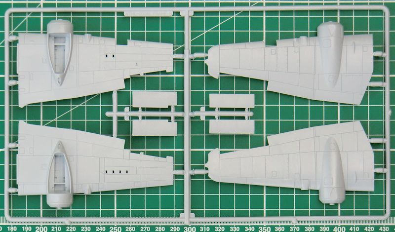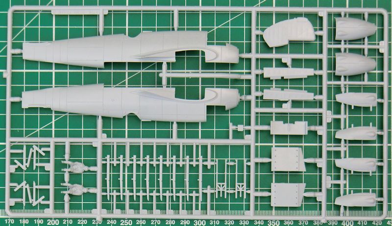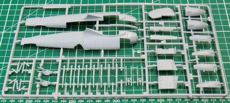 Die Bauteile sind sauber abgespritzt und besitzen feine Strukturen. Insgesamt ist der Aufbau des Bausatzes gut gelöst und ermöglicht auch Anfängern einen problemlosen Bau. Das Cockpit entsteht aus sechs Teilen. Davon ist die Wanne für den Piloten das größte Teil. Natürlich gibt es auch die übliche Pilotenfigur. Zwei Decals gestalten das Instrumentenbrett. Die Auspuffstutzen werden von innen eingeklebt. Die Tragfläche besteht aus Ober- und Unterteil. Dort sind die Ruder und die Klappen jeweils mit anmodelliert. Das sorgt für scharfe Hinterkanten. Für die Verkleidungen der Flächenwaffen und das ETC müssen noch paar angedeutete Bohrungen durchbrochen werden.