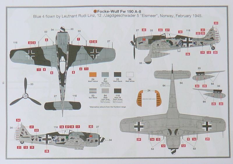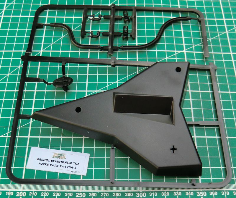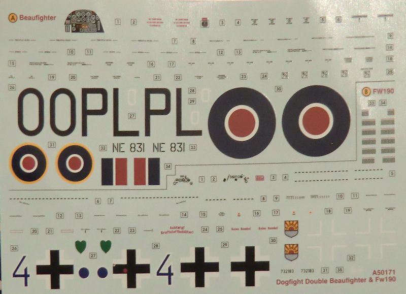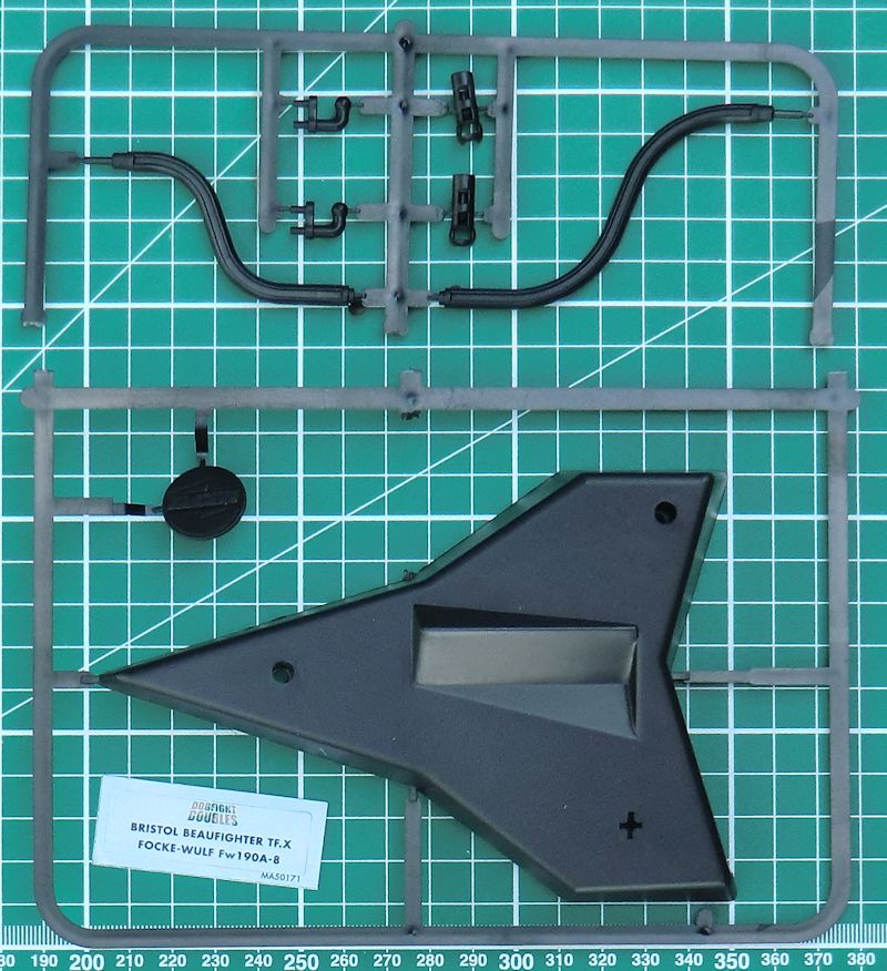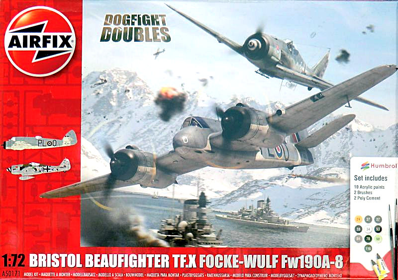 Einleitung: Dieses Set kombiniert die separat erhältlichen Bausätze der Bristol Beaufighter TF. X und der Focke Wulf Fw 190A-8 im Maßstab 1/72. Dazu gibt es einen stabilen Ständer zu dynamischen Präsentation der Modelle, zehn kleine Dosen Acrylfarben, zwei Pinsel und auch den Kleber. Die im Set möglichen Decalvarianten sind nur hiermit erhältlich. Es gibt eine gemeinsame mehrfarbige Bau- und Bemalungsanleitung. Der Druck des Decals ist tadellos. Es gibt natürlich auch Wartungshinweise.