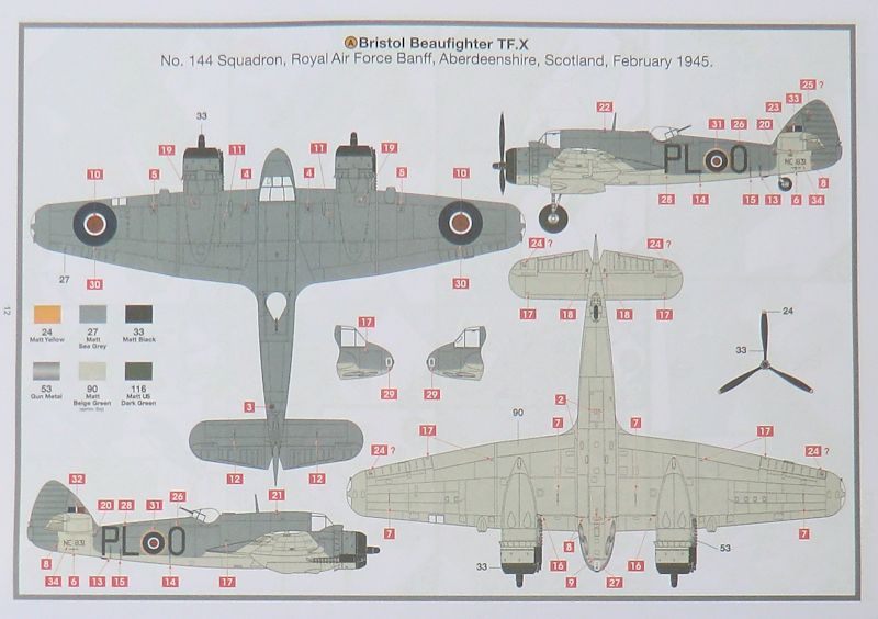 Bausatz: Im vergangenen Jahr erschien bei Airfix ein neuer Beaufighter TF. X im Maßstab 1/72. Dieser Bausatz überrascht auch wieder durch eine innovative Konstruktion. Es gibt vier hellgraue Spritzlinge mit 119 Einzelteilen und einen Klarsichtrahmen mit zwölf Teilen. Ein paar Teile sind für andere Varianten bestimmt und wandern in die Restekiste.